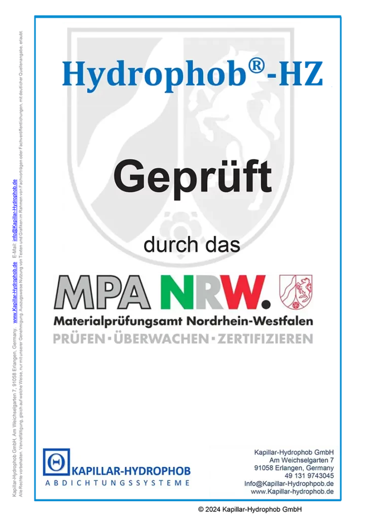 Das von uns eingesetzte hydrophobierende Injektat ist durch das Materialprüfungsamt getestet und in seiner Wirkung somit amtlich nachgewiesen.