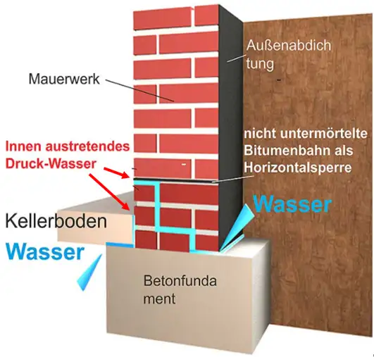 Ein Versteckter Druckwasserschaden kann auch nach der Behebung eines „offenen“ Druckwasserschadens durch Über– oder Unterwanderung des Wassers an den Elementen der Bauwerksgründung erfolgen. Hier können Kombisperren aus Hydrophobierung und Harzverpressung sinvoll sein.