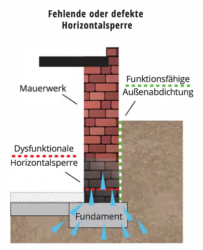Hier ist in 90% der Fälle eine Hydrophobierung als Horizontal- und/oder Flächensperre die Maßnahme der Wahl, um ein nachhaltig trockenes Mauerwerk zu erhalten.
