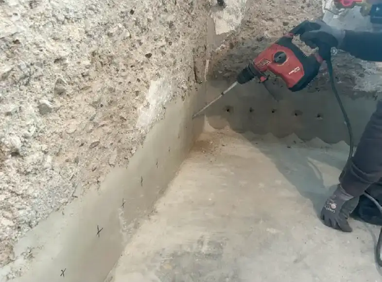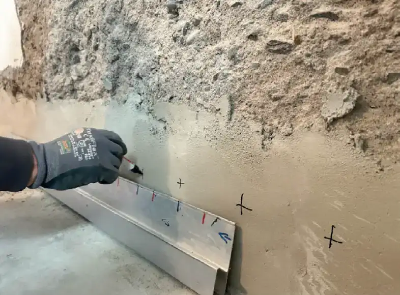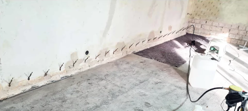 An der Wand wird eine waagerechte Linie in einer Höhe von 10 bis 15 cm über dem Bodenbelag angeschlagen. Die Bohrlochpunkte werden jeweils in einem Abstand von bis zu 25 cm markiert. Je nach Struktur, Art und Dicke des Mauerwerks werden die Bohrlöcher für die Injektionen in einem geeigneten Winkel angezeichnet und mit der berechneten Bohrtiefe gesetzt.