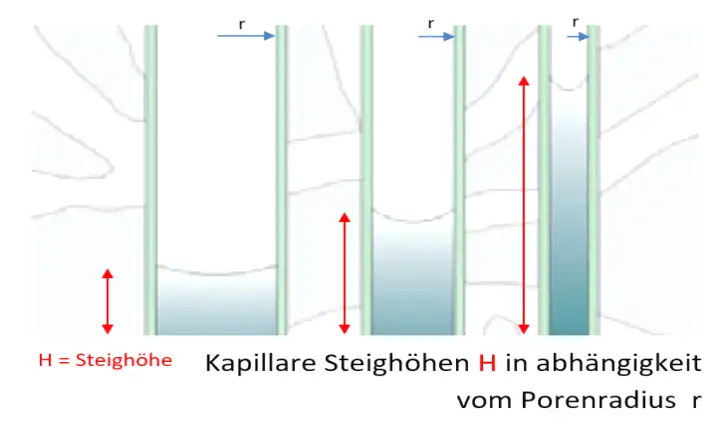 Wenn eine Horizontalsperre fehlt oder durch Alterung oder anfängliche Baumängel nicht mehr voll funktionsfähig ist, steigt das Kapillarwasser im Mauerwerk nach oben – und zwar entgegen der Schwerkraft. Das liegt an der Kapillarität, die in sämtlichen mineralischen Baustoffen immer gegeben ist.