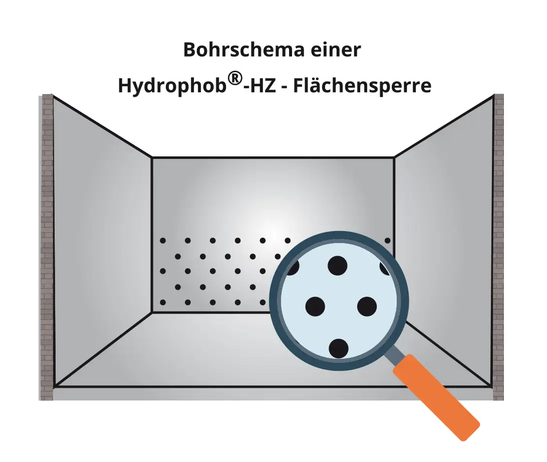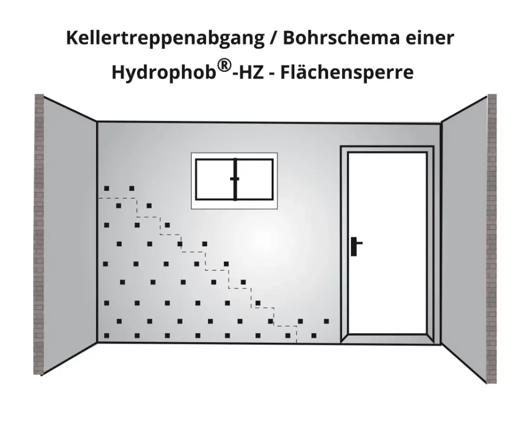 Hydrophob®-HZ wird dabei wie bei einer Horizontalsperre lediglich mehrreihig in einem schachbrettartigen Bohrraster in das Mauerwerk injiziert.