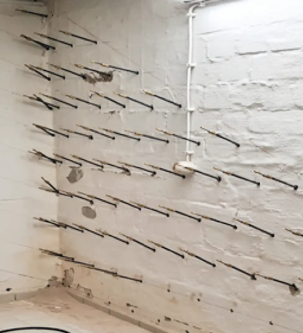 Hier werden mehrere Reihen der Horizontalsperre nun im Schachbrettmuster mit einem Bohrloch-Raster von 25cm × 25cm bzw. 12,5cm × 12,5 cm mit Hydrophob®-HZ in das Mauerwerk von der Innenseite injiziert.