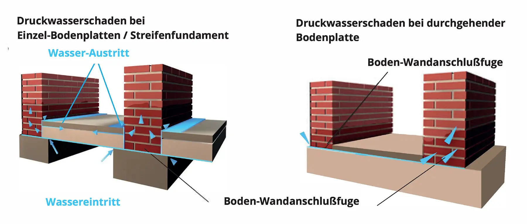 Das Problem: Stau-, Schichten- oder kurzzeitig ansteigendes Grundwasser dringt über die Boden-Wand-Anschlussfuge in das Gebäudeinnere ein und kann je nach konstruktiver Ausführung der Bauteile an unterschiedlichen Stellen austreten. Nicht immer ist das Mauerwerk die Eintrittsstelle, an der das flüssige Wasser austritt!