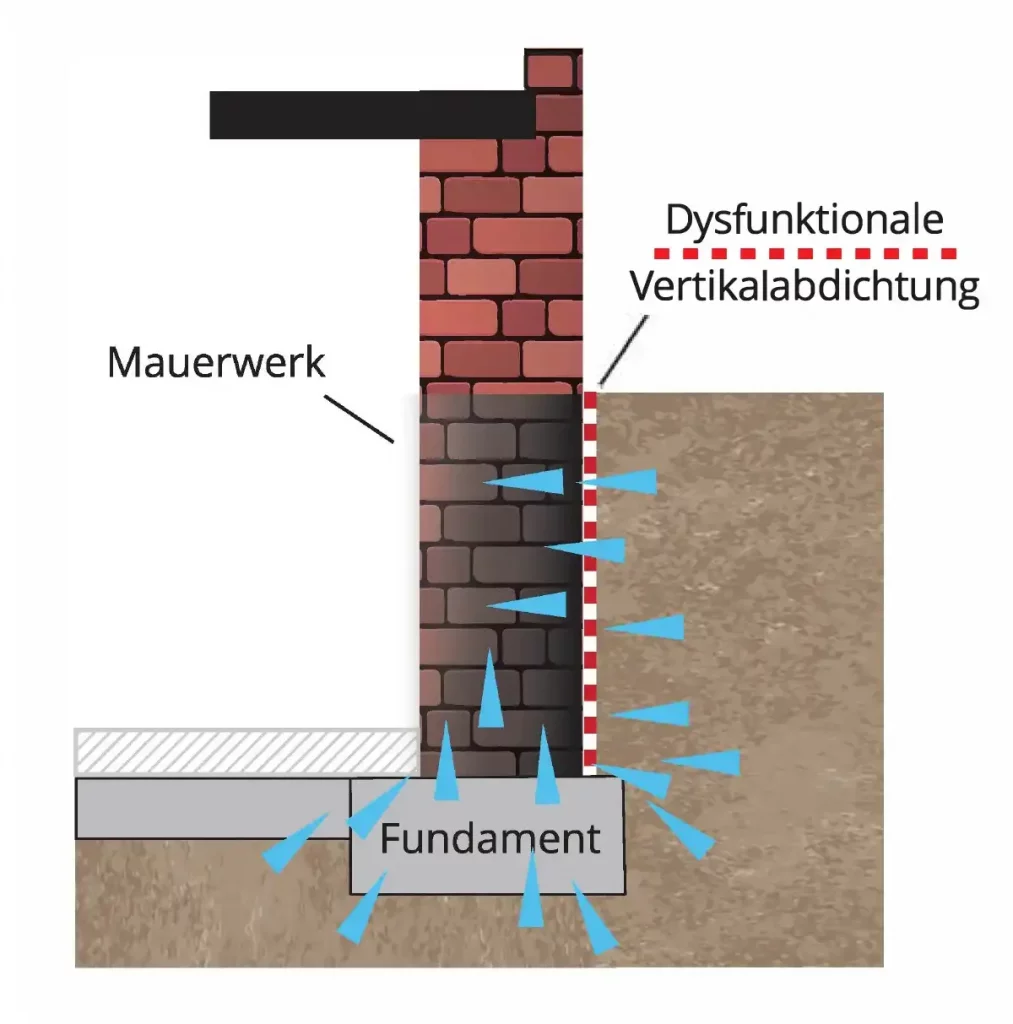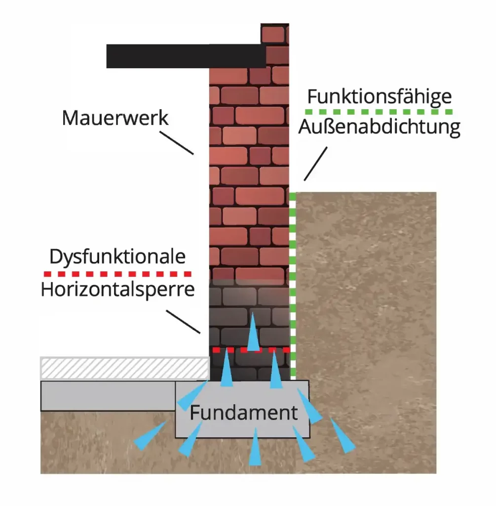 Auch hier kann Baugrundfeuchte, Schichtenwasser oder kurzzeitig wiederkehrend steigendesGrundwasser direkt quer in das erdberührte Grundmauerwerk eindringen, wenn die Außenabdichtung beschädigt oder alterungsbedingt nicht voll funktionsfähig ist.