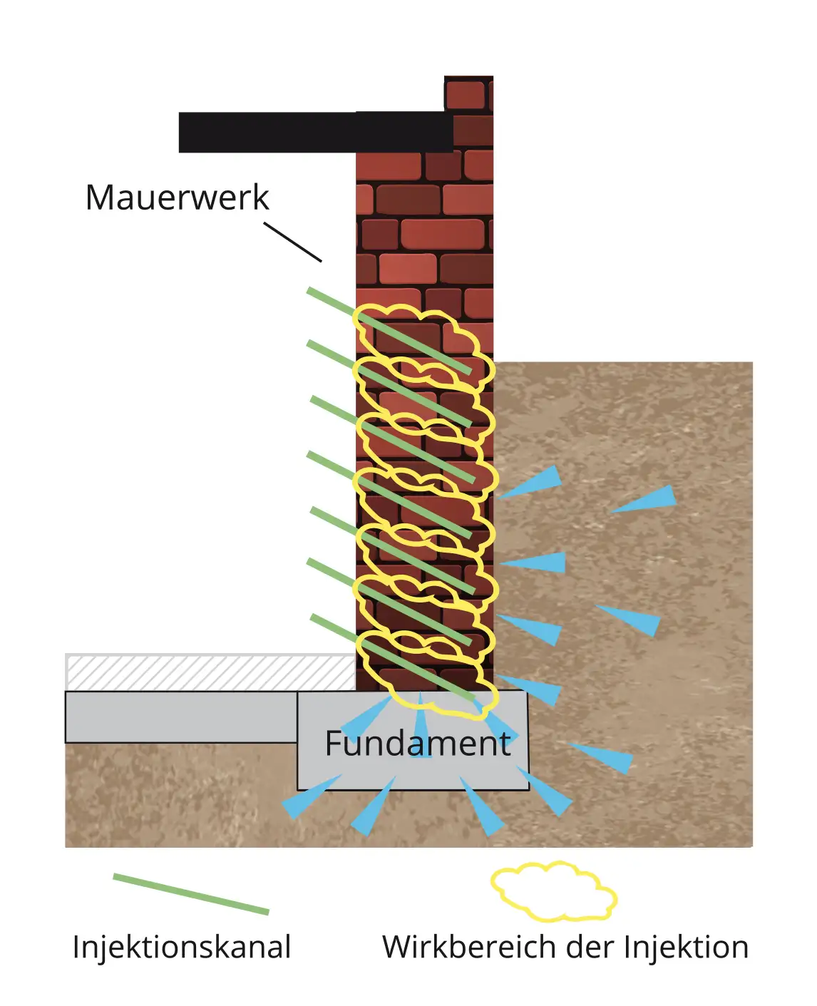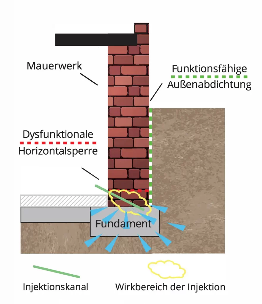Dadurch entsteht in kürzester Zeit ein nachhaltig kerntrockenes Mauerwerk, ohne dass ein Aufgraben bis auf das Fundament (mit allen negativen Begleiterscheinungen) erforderlich ist.